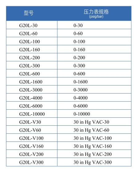 G20系列壓力表主要使用于減壓器及管路系統壓力顯示,壓力表規格為2",進氣螺紋為1/4"NPT,壓力表精度為2.5級,3-2-3 %。材質:316L(與介質接觸部分)